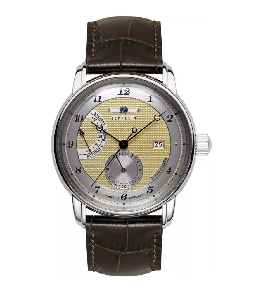 Zeppelin Friedrichshafen Automatic 8590-5 sú elegantné pánske hodinky inšpirované klasickým dizajnom historických vzducholodí Zeppelin. Model z kolekcie Friedrichshafen spája tradičné hodinárske prvky, kvalitný mechanický strojček a nadčasový vzhľad, ktorý sa hodí ako na oblek, tak na každodenné nosenie. Hodinky majú oceľové puzdro s priemerom 42 mm doplnené hnedým koženým remienkom, ktorý podčiarkuje ich elegantný charakter. Zlatavý ciferník s jemným vzorom Clous de Paris je doplnený arabskými číslicami a niekoľkými praktickými funkciami – ukazovateľom rezervy chodu, 24-hodinovým subciferníkom a dátumom na pozícii tretej hodiny.