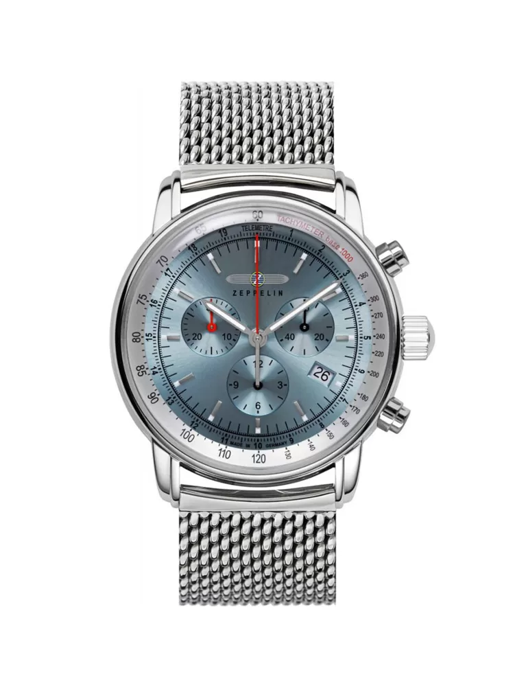 Model Zeppelin 8886M-3 je vybavený veľmi zaujímavým riadkom funkcií. Na prvý pohľad zaujmú predovšetkým stopky. Centrálna rúčka slúži ako sekundová po ich zapnutí. V subcefníku na 6. pozícii nájdete 12 hodinový čítač, na 9. hodine je potom čítač 30 minútový. Z ďalších funkcií ponúka tento model aj praktický ukazovateľ dátumu na pozícii 4. hodiny, telemeter, či tachymeter. Ten slúži na meranie rýchlosti na vzdialenosti jedného kilometra. Ciferník je chránený minerálnym sklíčkom. S priemerom puzdra 42 mm skvele padnú na väčšinu pánskych zápästí. Model je poháňaný batériovým švajčiarskym strojčekom Ronda 5130. so 6 kameňmi. Vodotesnosť robí 50m. Hodinky teda nie je nutné dávať dole z ruky ani pri umývaní rúk, či sprchovaní.