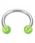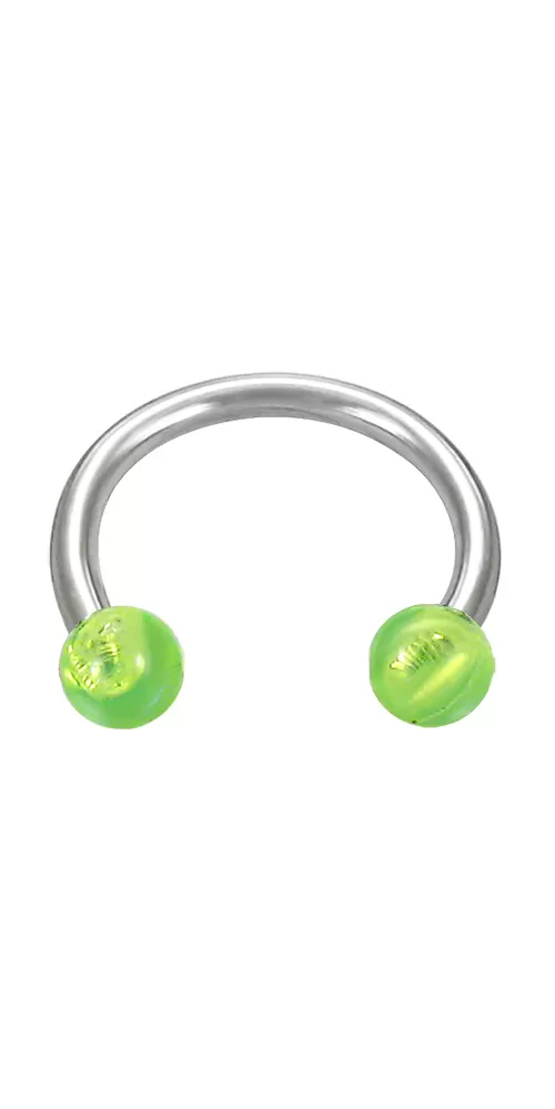 Moderný piercing nielen do bradavky je vyrobený z chirurgickej ocele v lesklej povrchovej úprave. Piercing je ozdobený svietivými žltozelenými guličkami.