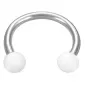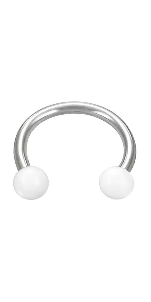 Moderný piercing nielen do bradavky je vyrobený z chirurgickej ocele v lesklej povrchovej úprave. Piercing je ozdobený bielymi guličkami.