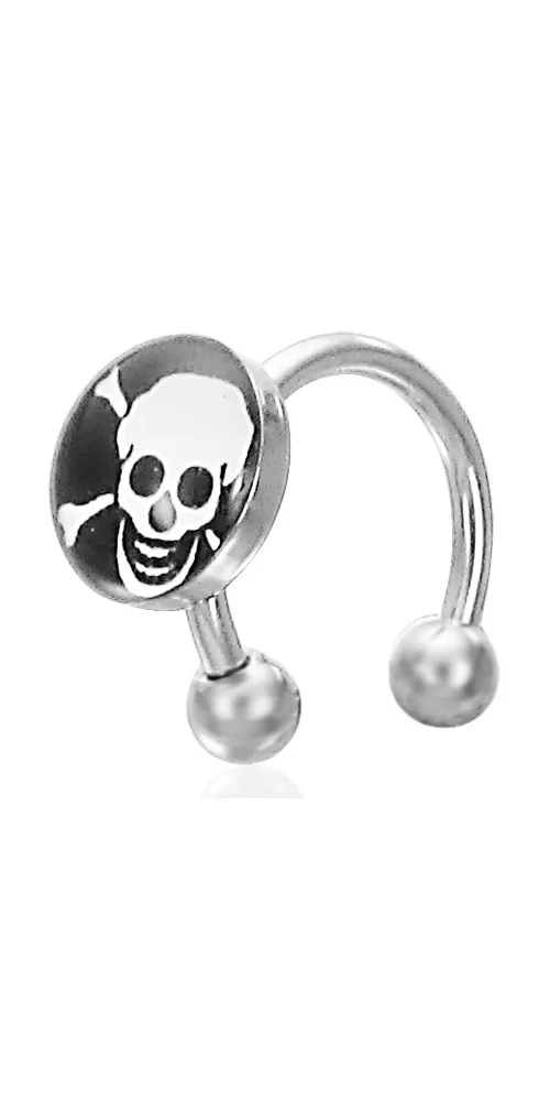 Moderný piercing nielen do bradavky je vyrobený z chirurgickej ocele v lesklej povrchovej úprave. Piercing je ozdobený guličkami a lebkou.