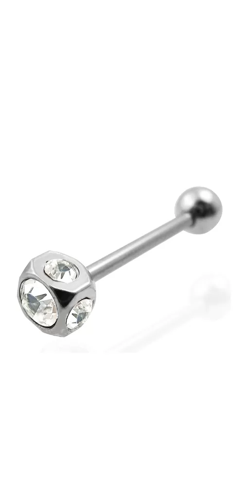 Moderný piercing do jazyka je vyrobený z chirurgickej ocele v lesklej povrchovej úprave. Piercing je ozdobený kockou v ktorej sú zasadené biele zirkóny.
