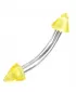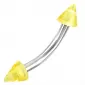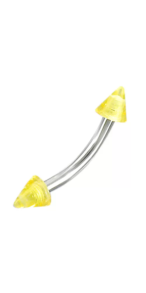Moderný piercing do obočia je vyrobený z chirurgickej ocele v lesklej povrchovej úprave. Piercing je ozdobený žltými hrotmi.