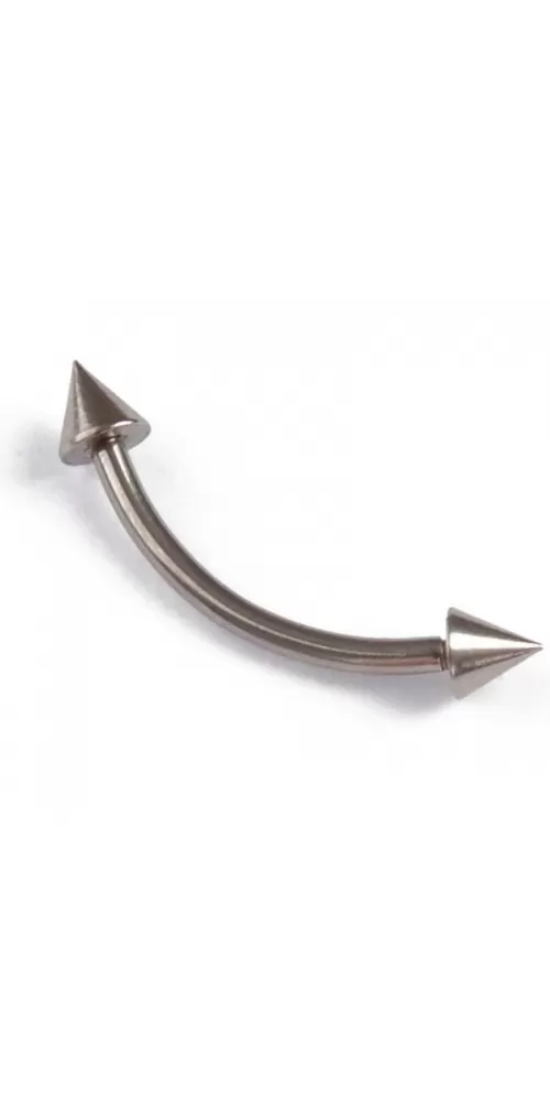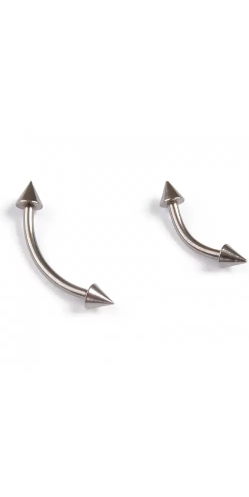 Moderný piercing do obočia vyrobený z chirurgickej ocele s hrotmi na oboch koncoch v lesklej povrchovej úprave.