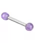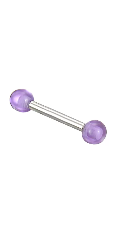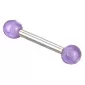 Moderný piercing do obočia je vyrobený z chirurgickej ocele v lesklej povrchovej úprave. Piercing je ozdobený fialovými guličkami.