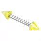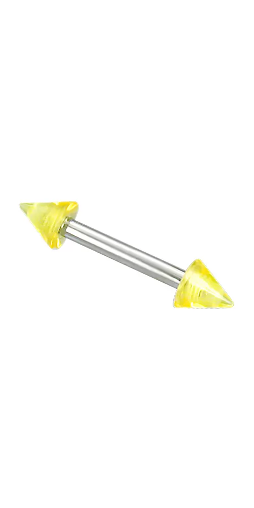 Moderný piercing do obočia je vyrobený z chirurgickej ocele v lesklej povrchovej úprave. Piercing je ozdobený žltými hrotmi.