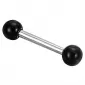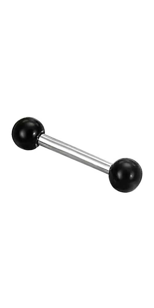 Moderný piercing do obočia je vyrobený z chirurgickej ocele v lesklej povrchovej úprave. Piercing je ozdobený čiernymi guličkami.