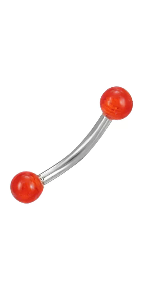 Moderný piercing do obočia je vyrobený z chirurgickej ocele v lesklej povrchovej úprave. Piercing je ozdobený červenými guličkami.