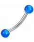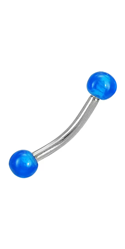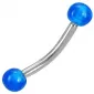 Moderný piercing do obočia je vyrobený z chirurgickej ocele v lesklej povrchovej úprave. Piercing je ozdobený modrými guličkami.