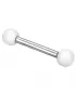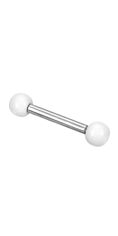 Moderný piercing do obočia je vyrobený z chirurgickej ocele v lesklej povrchovej úprave. Piercing je ozdobený bielymi guličkami.