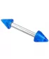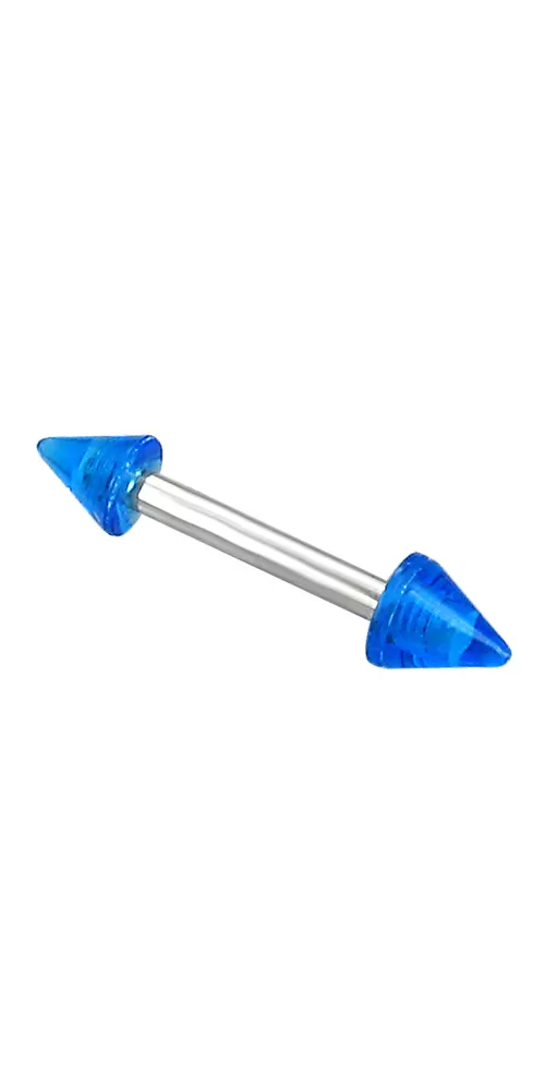 Moderný piercing do obočia je vyrobený z chirurgickej ocele v lesklej povrchovej úprave. Piercing je ozdobený modrými hrotmi.