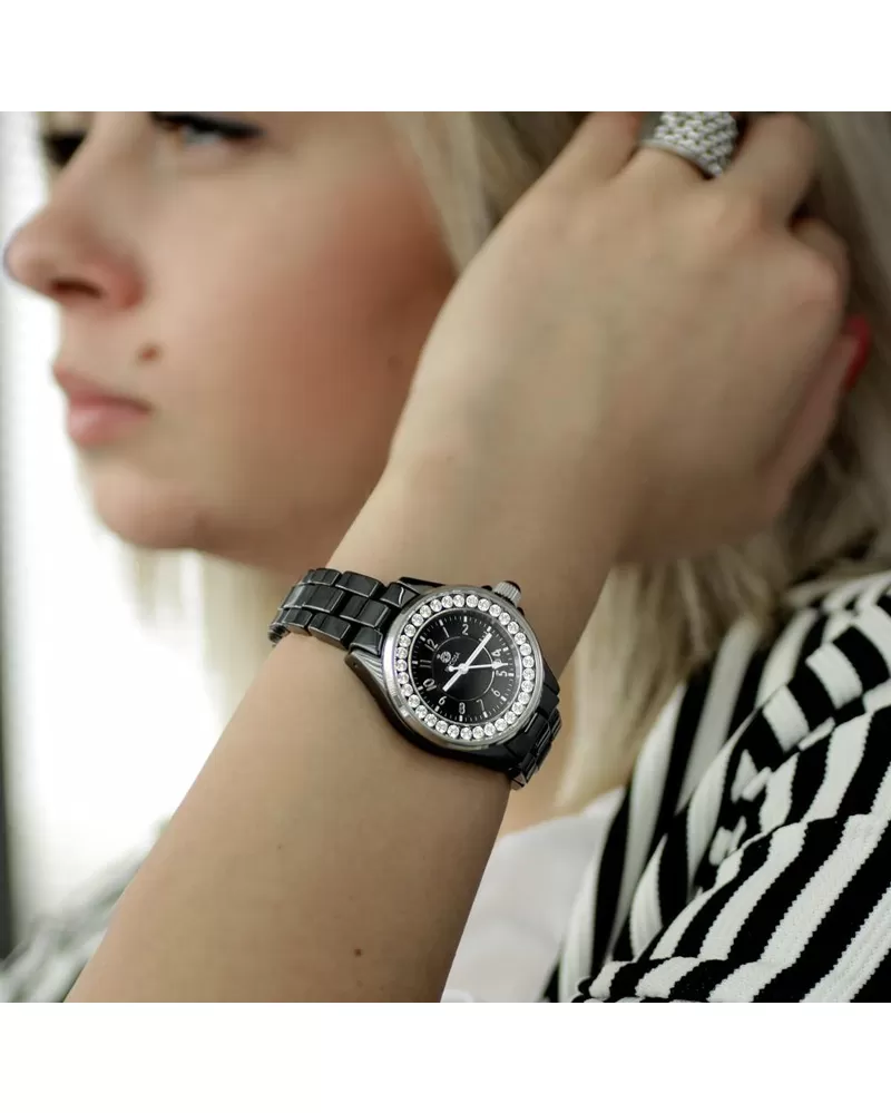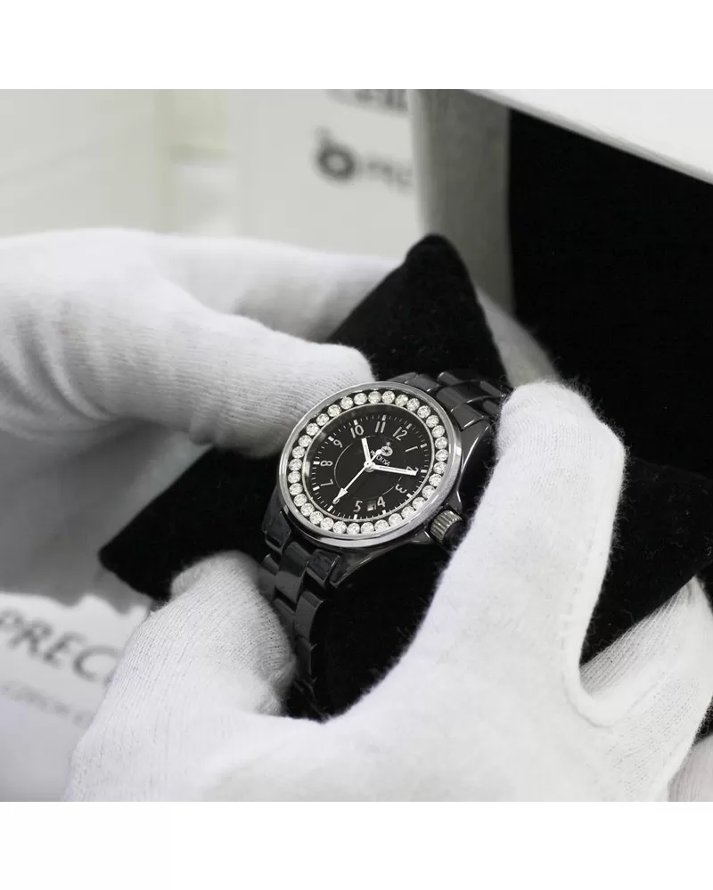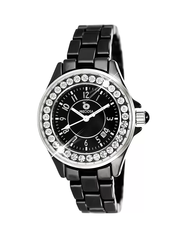 Kolekcia dámskych luxusných hodiniek PRIM v sebe kombinuje keramické prevedenie v kombinácii s leštenou ušľachtilou oceľou. V celej kolekcii nájdete moderné prepojenie kubickej zirkónie a kvalitných materiálov. Puzdro a ťah sú vyrobené z keramického materiálu, ktorý je veľmi odolný proti poškriabaniu. Na krúžku z ušľachtilej ocele 316 L sú zafasované kryštály PRECIOSA. Zdobenie puzdra kubickou zirkóniou PRECIOSA je prevedené CNC technológiou, kedy sú kryštály fasované do oceľového krúžku. 5 ATM zaručuje odolnosť proti vode pri bežnom používaní.