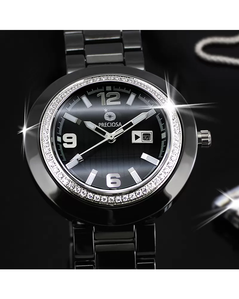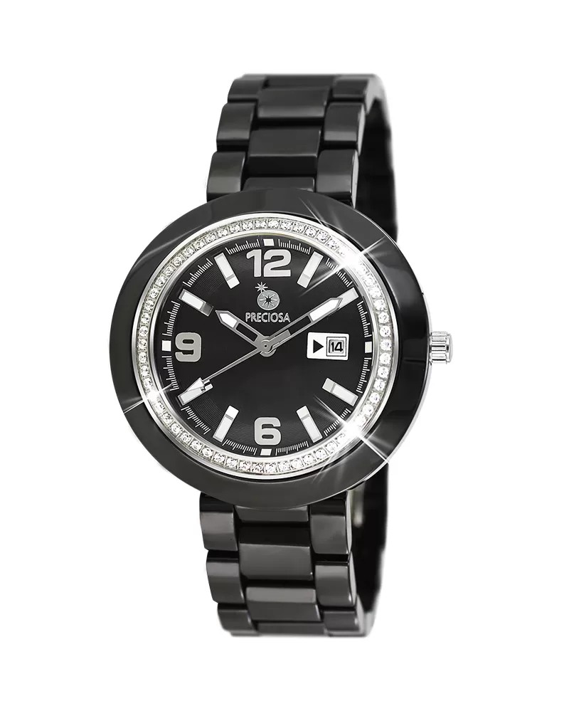 Kolekcia dámskych luxusných hodiniek PRIM v sebe kombinuje keramické prevedenie v kombinácii s leštenou ušľachtilou oceľou. V celej kolekcii nájdete moderné prepojenie kubickej zirkónie a kvalitných materiálov. Puzdro a ťah sú vyrobené z keramického materiálu, ktorý je veľmi odolný proti poškriabaniu. Na krúžku z ušľachtilej ocele 316 L sú zafasované kryštály PRECIOSA. Zdobenie puzdra kubickou zirkóniou PRECIOSA je prevedené CNC technológiou, kedy sú kryštály fasované do oceľového krúžku. 5 ATM zaručuje odolnosť proti vode pri bežnom používaní.