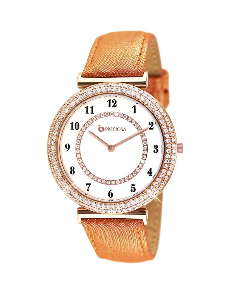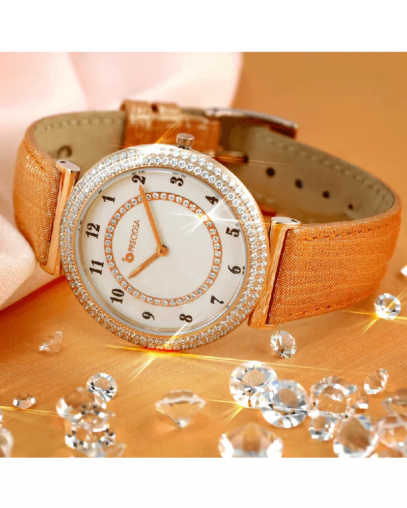 Dizajnové dámske hodinky PRIM Preciosa, ktoré oslnia svojim klasickým a nadčasovým vzhľadom. Čistý dizajn hodiniek vo farebnom modernom prevedení zanechá skutočný dojem. Puzdro je vyrobené z ocele, upravenej leštením do vysokého lesku. Zdobenie puzdra kubickou zirkóniou PRECIOSA je prevedené CNC technológiou, kedy sú kryštály fasované do oceľového puzdra.