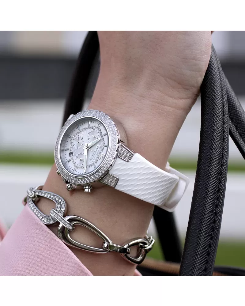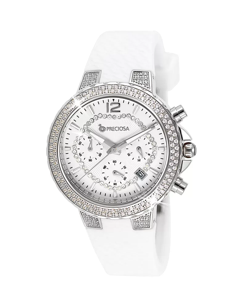 Štýlové dámske chronografy predstavujú vrcholný štýl modelov Preciosa a okrem nápaditého vzhľadu sú kombináciou špičkových materiálov a moderného vzorovaného remienka, ktorý je prevedený v antialergénnom silikóne.Púzdro je vyrobené z ušľachtilej ocele 316L upravenej leštením do vysokého lesku. Zdobenie puzdra kubickou zirkóniou PRECIOSA je prevedené CNC technológiou, kedy sú kryštály fasované do oceľového puzdra.