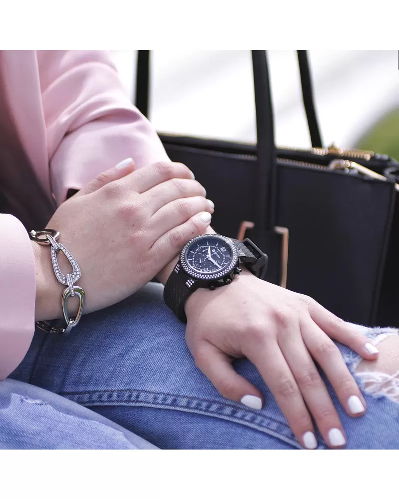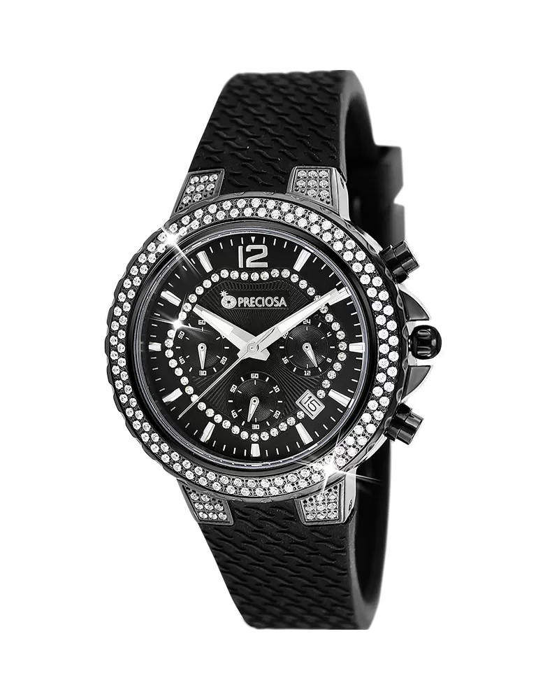 Štýlové dámske chronografy predstavujú vrcholný štýl modelov Preciosa a okrem nápaditého vzhľadu sú kombináciou špičkových materiálov a moderného vzorovaného remienka, ktorý je prevedený v antialergénnom silikóne. je vyrobené z ušľachtilej ocele 316L upravenej leštením do vysokého lesku. Zdobenie puzdra kubickou zirkóniou PRECIOSA je prevedené CNC technológiou, kedy sú kryštály fasované do oceľového puzdra.