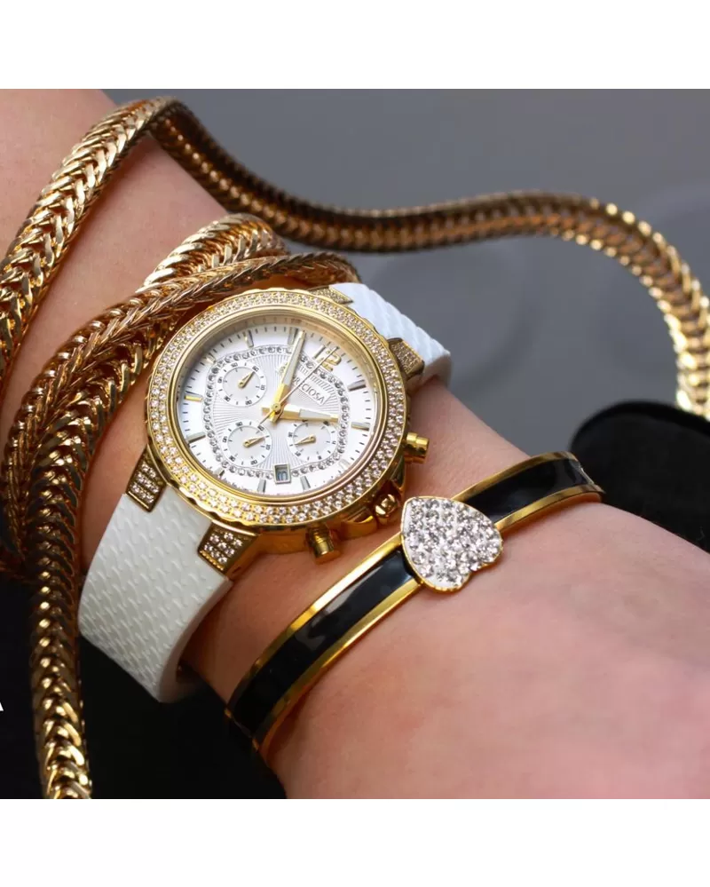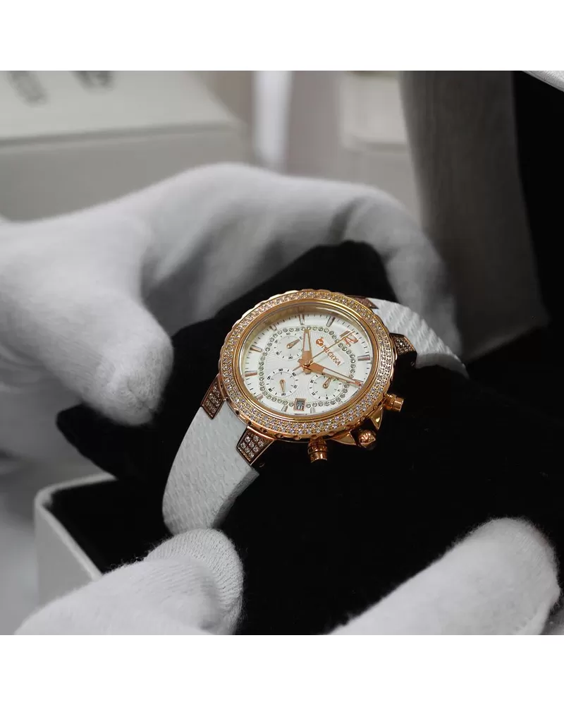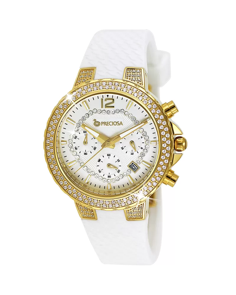 Štýlové dámske chronografy predstavujú vrcholný štýl modelov Preciosa a okrem nápaditého vzhľadu sú kombináciou špičkových materiálov a moderného vzorovaného remienka, ktorý je prevedený v antialergénnom silikóne.Púzdro je vyrobené z ušľachtilej ocele 316L upravenej leštením do vysokého lesku. Zdobenie puzdra kubickou zirkóniou PRECIOSA je prevedené CNC technológiou, kedy sú kryštály fasované do oceľového puzdra.