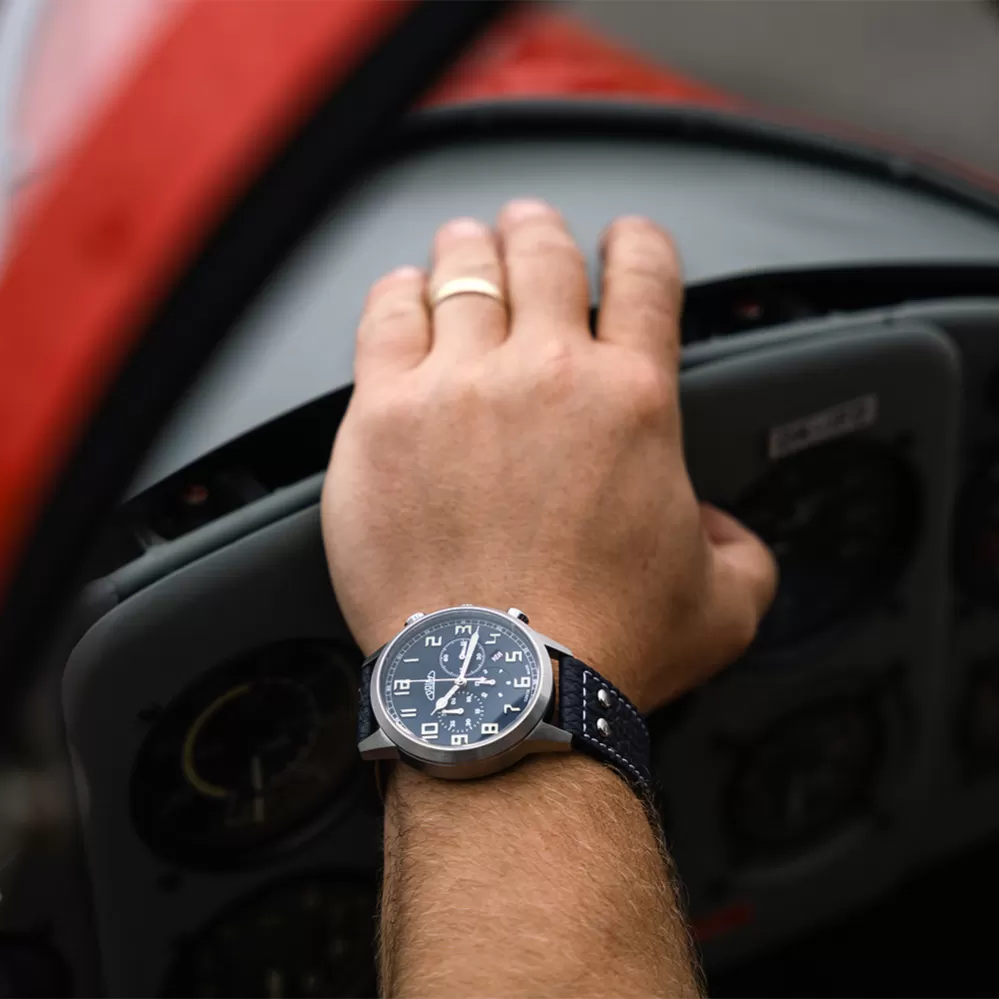 Exkluzívny pilot mechanické hodinky s chronografom a automatickým naťahovaním. Puzdro je vyrobené z ušľachtilej nerezovej ocele 316L v kombinácii lesku a matu. Po úspešnej edícii predchádzajúceho modelu, sme sa opäť rozhodli použiť strojček NE88A (Seiko), ktorý ocenia skutoční znalci. Pilotské výrazné dynamické prvky sú viditeľné na prednej strane prepracovaného číselníka. Pilot rúčky a indexy sú pokryté super lumini vrstvou a umožňujú tak odpočet času pri zníženej viditeľnosti. Hodinky sú vybavené kvalitným antireflexným zafírovým sklom. Vodeodolnosť 10 ATM zaručuje vysokú odolnosť aj pre náročných zákazníkov.