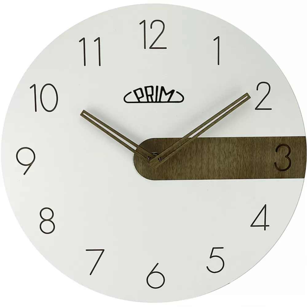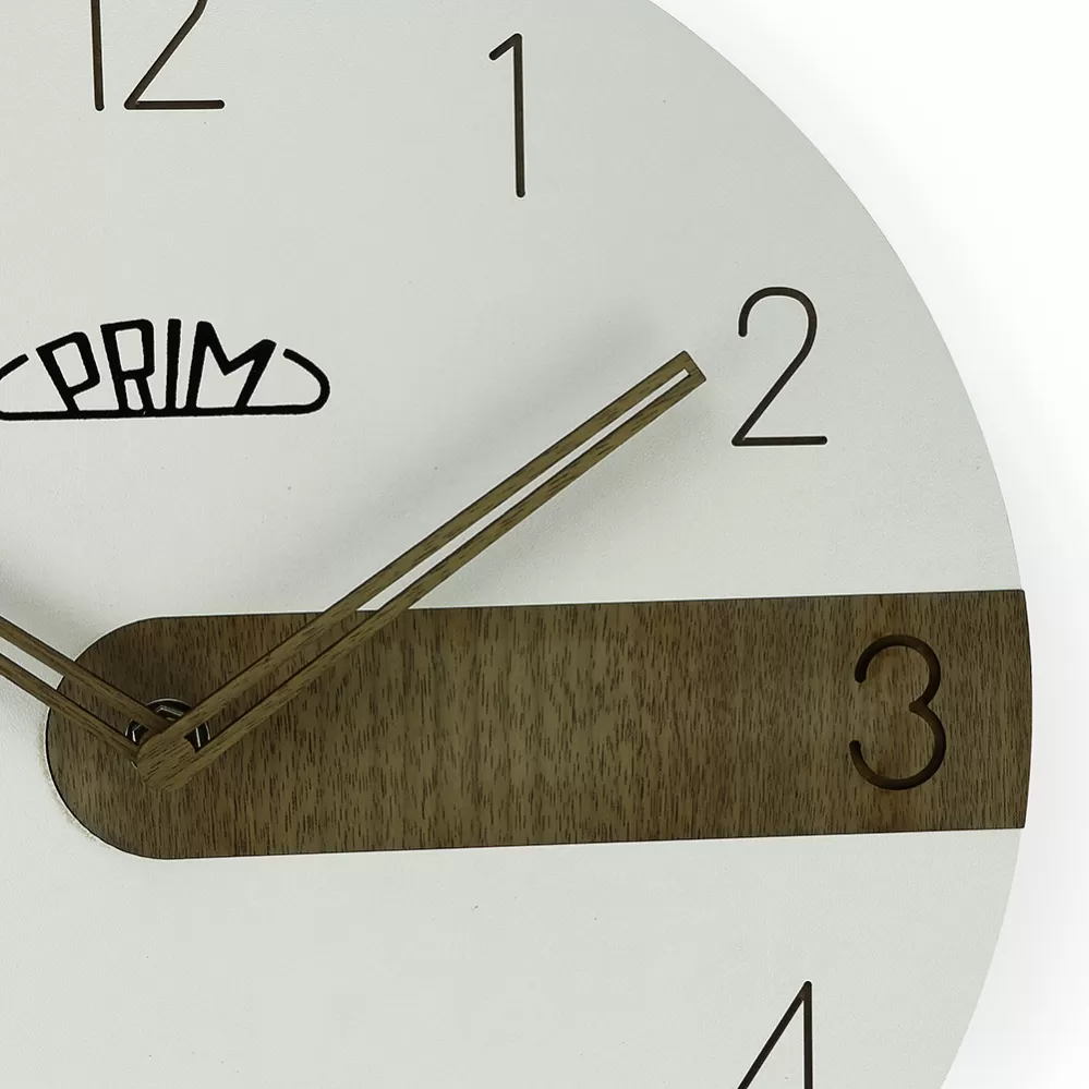 Nástenné drevené hodiny PRIM Clear Timber majú jemný elegantný a tradičný číselník s arabskými číslicami, ktoré sú prehĺbené do čisto bieleho tela. Hodiny sú vyrobené z MDF a ich hlavnou dominantou je zvýraznená 3 hodina na číselníku designovo zvolenou drevenou časťou, ktorá spoločne s ručičkami v rovnakom drevenom prevedení vytvára z hodín harmonický kúsok. Rozmery 290 x 40 mm.