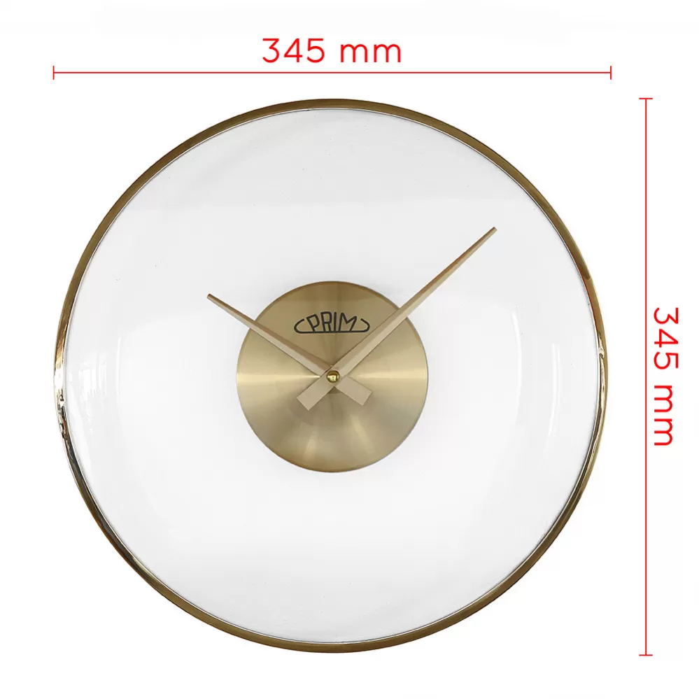 Nástenné plastové hodiny PRIM Pellucid Lens vďaka vypuklému minerálnemu sklu, ktoré dodáva hodinám nádych luxusu, pôsobí ako veľká priehľadná šošovka. Spoločne so zlatistými prvkami vytvára hodiny elegantný dojem. odiny majú rozmery 345x345 mm a sú napájané 1 ks ceruzkové batérie AA (nie je súčasťou balenia). Vo vašom interiéri vytvorí útulnú a sofistikovanú atmosféru.