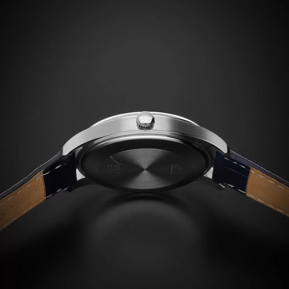Vnútri týchto hodiniek napájaných batériou pracujeQuartz ETA F06.412. Sú doplnené kvalitným koženým remienkom.