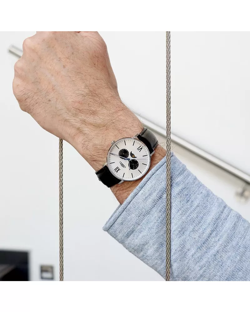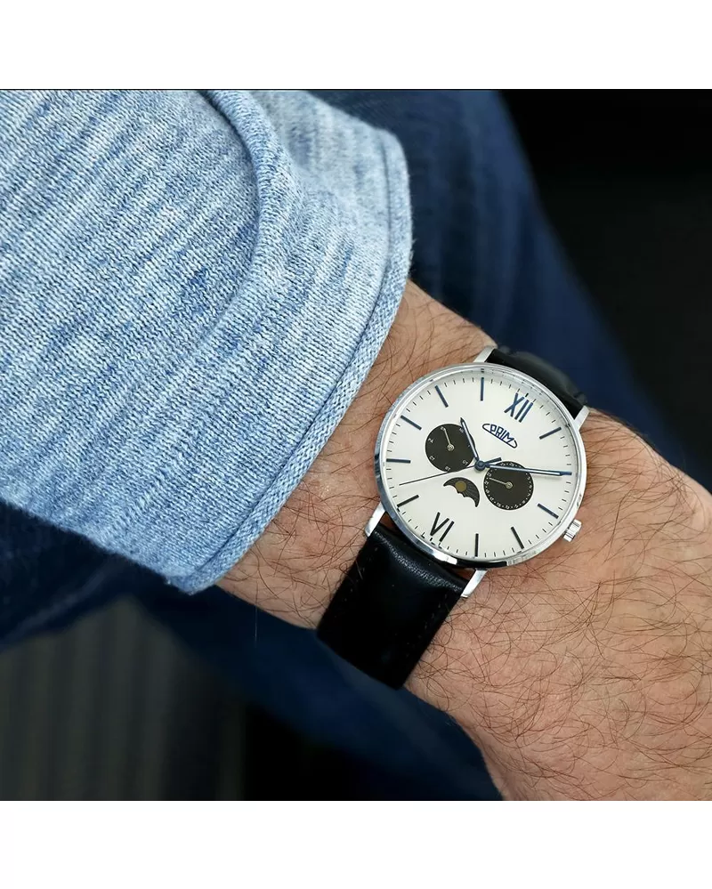 Klasický a čistý dizajn predstavujú tieto spoločenské hodinky. Puzdro hodiniek je vyrobené z nerezovej ocele, ktorá je vyleštená do vysokého lesku. Leštený ciferník dopĺňajú vystúpené kontrastné indexy a dva ciferníky, ktoré zobrazujú dni a týždne. Kvalitný kožený remienok je pohodlný a dopĺňa ležérny štýl hodiniek. Ak hľadáte klasický model, ktorý vás bude dokonale reprezentovať, tak tento je ten pravý.