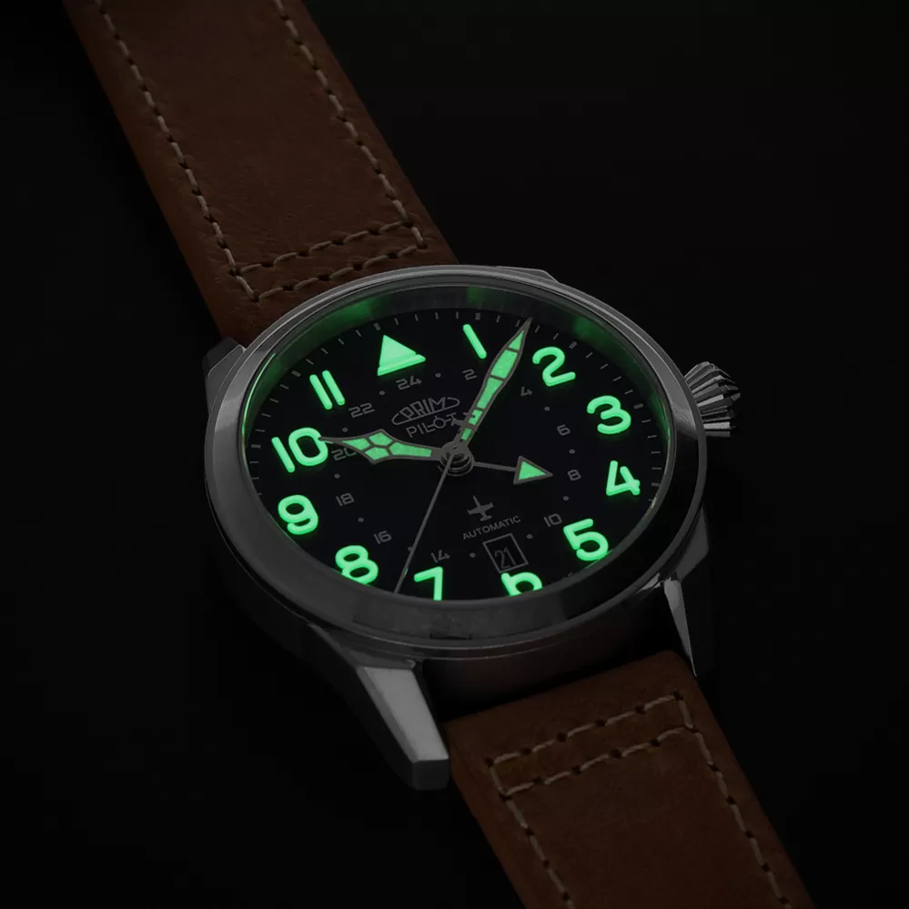 Automatické hodinky so zafírovým sklom a plastovými luminiscenčnými indexmi, ktoré sú dominantnou črtou hodinového pilota. Vychutnajte si doplnok, s ktorým sa ocitnete vo výškach za okamih - aj keď stojíte na zemi s nohami.