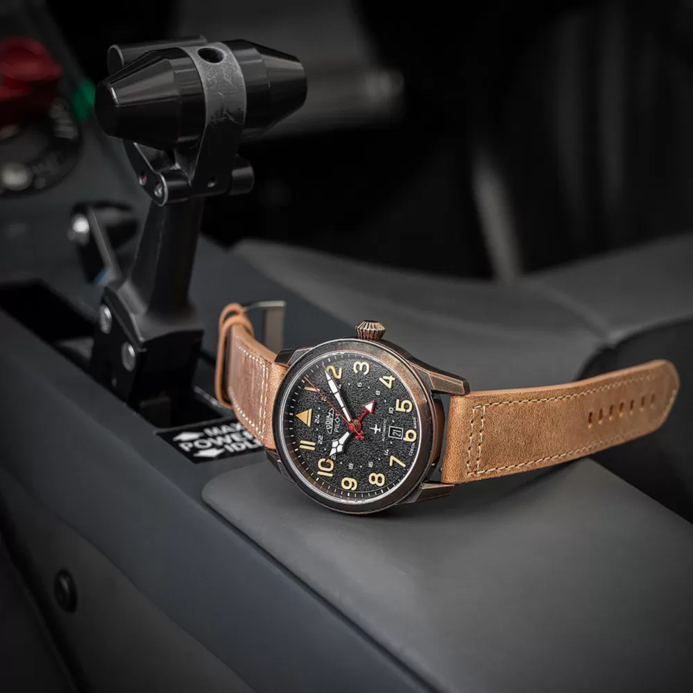 Automatické hodinky so zafírovým sklom a plastovými luminiscenčnými indexmi, ktoré sú dominantnou črtou hodinového pilota. Vychutnajte si doplnok, s ktorým sa ocitnete vo výškach za okamih - aj keď stojíte na zemi s nohami.
