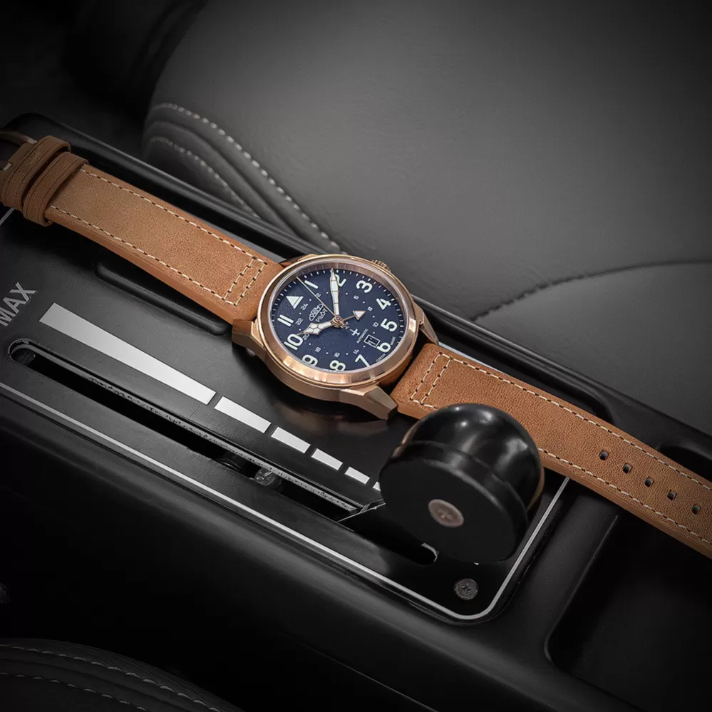 Automatické hodinky so zafírovým sklom a plastovými luminiscenčnými indexmi, ktoré sú dominantnou črtou hodinového pilota. Vychutnajte si doplnok, s ktorým sa ocitnete vo výškach za okamih - aj keď stojíte na zemi s nohami.