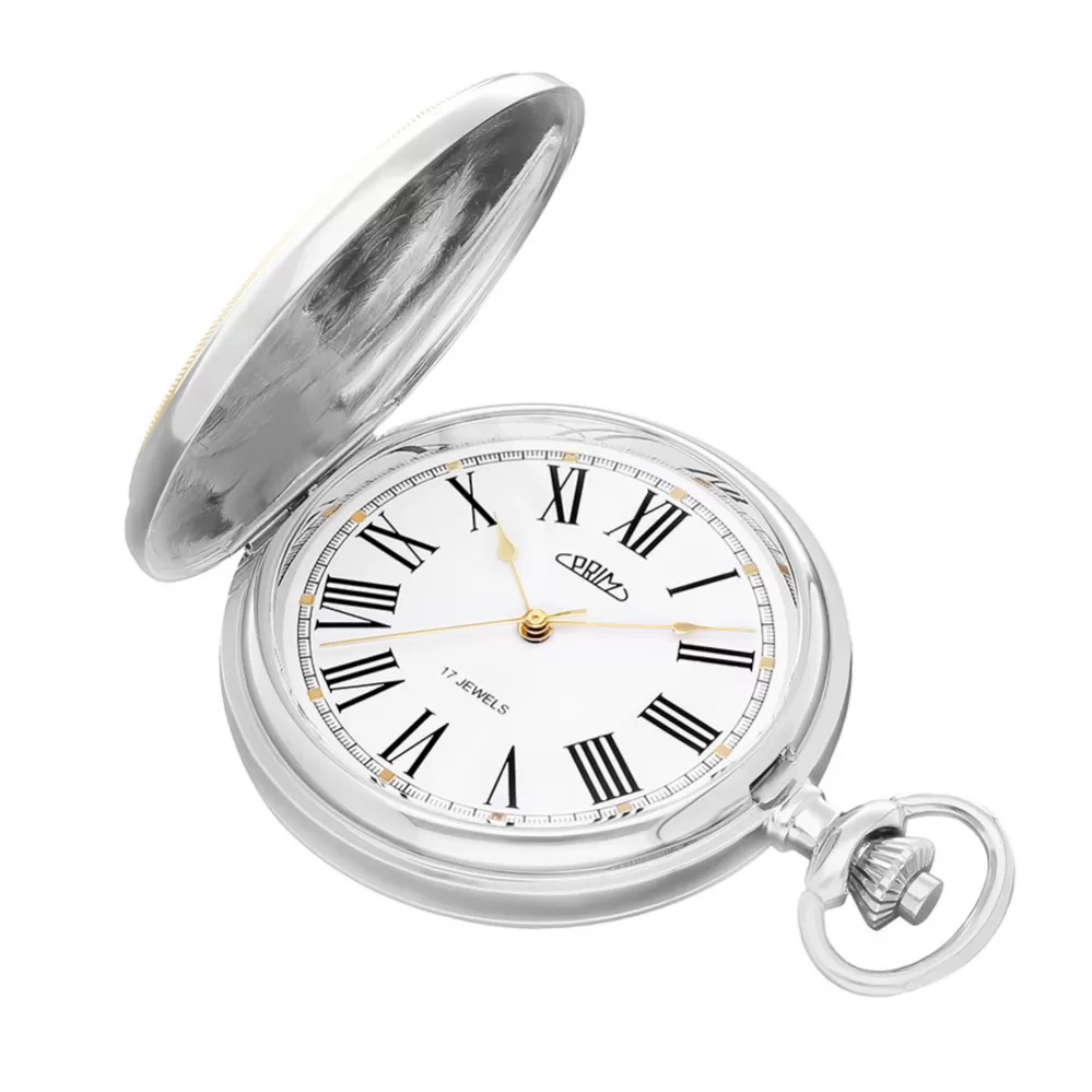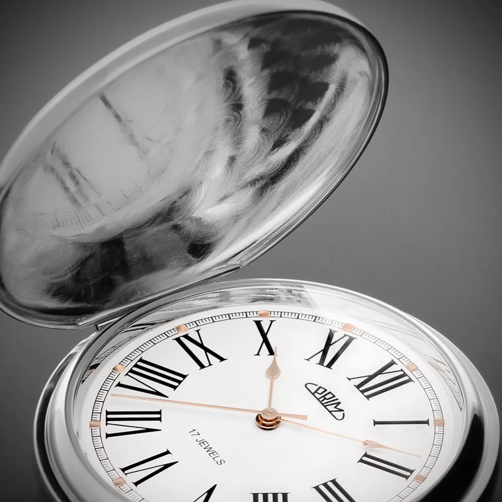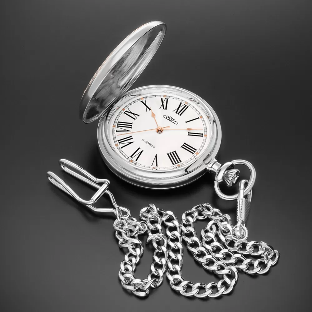 Klasické mechanické vreckové hodinky PRIM s ručným náťahom s rímskymi číslicami. Novo navrhnutý plášť hodiniek zdobí symbol českého znaku, teda dvojchvostový lev doplnený erbom, ktorý sa perfektne hodí na individualizáciu monogramu. Hodinky sú dodávané s nerezovou retiazkou. Rozmery 50 x 68 x 14 mm.