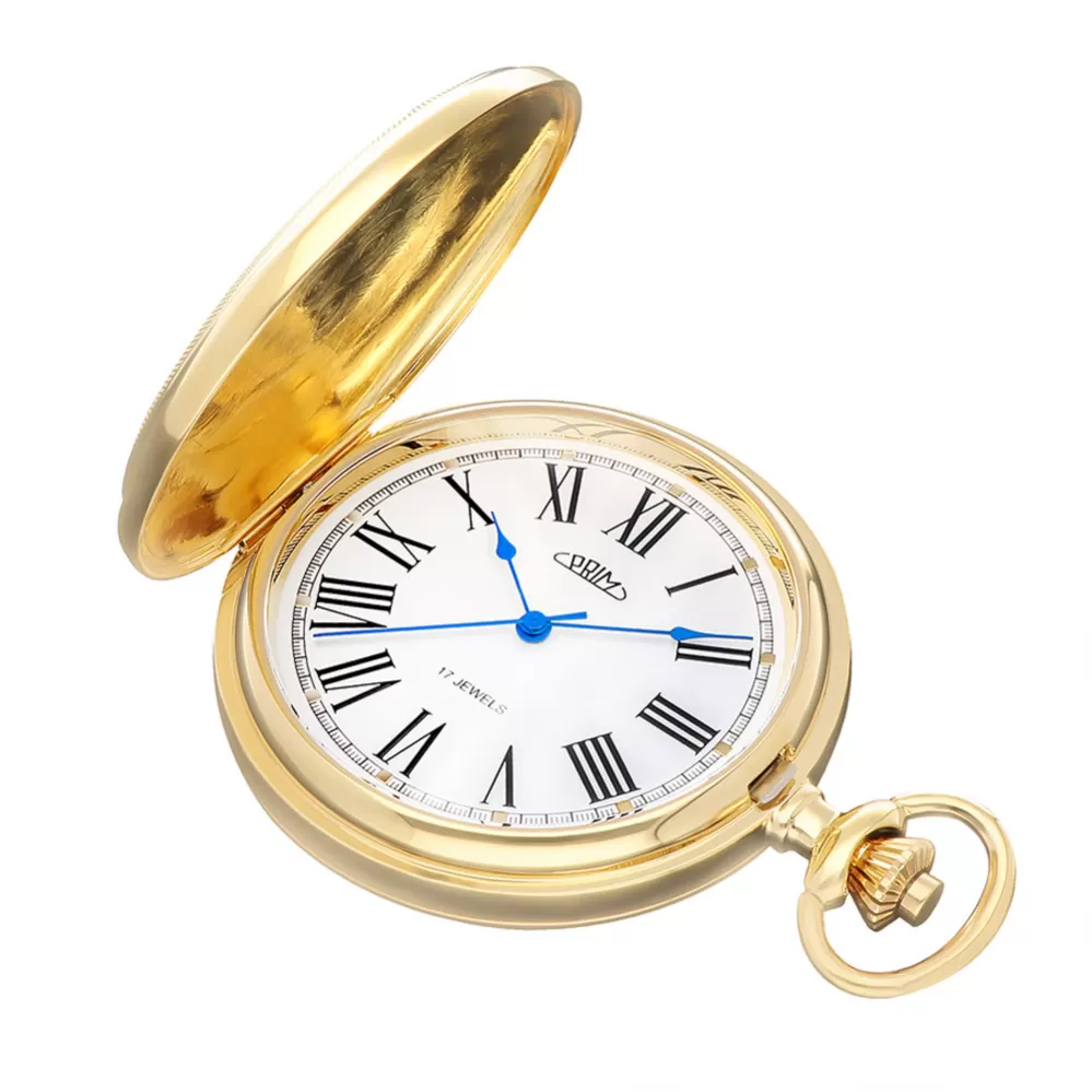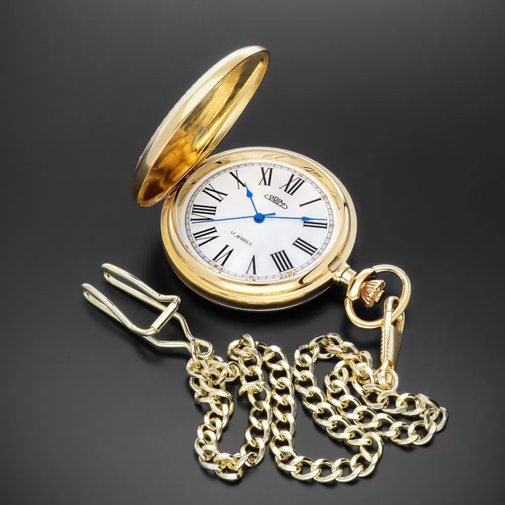 Klasické mechanické vreckové hodinky PRIM s ručným náťahom s rímskymi číslicami. Novo navrhnutý plášť hodiniek zdobí symbol českého znaku, teda dvojchvostový lev doplnený erbom, ktorý sa perfektne hodí na individualizáciu monogramu. Hodinky sú dodávané s nerezovou retiazkou. Rozmery 50 x 68 x 14 mm.