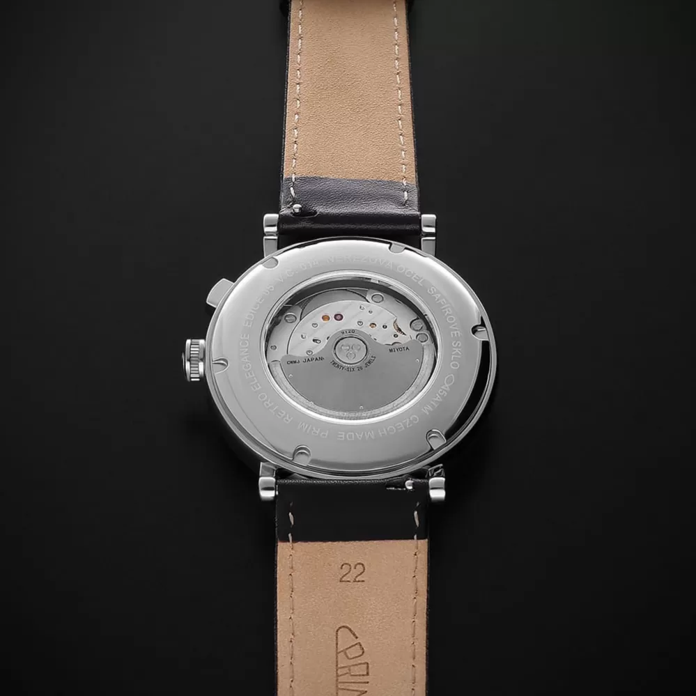 Prim retro elegancia 2025 - Elegantné pánske hodinky s Miyota 9120, zafírové sklo, priehľadné tekvicové a kožené popruhy v rôznych farbách. Klasické v modernom koncepte. Nová kolekcia pánskych hodiniek, ktoré kombinujú čistý dizajn s presným remeslom.