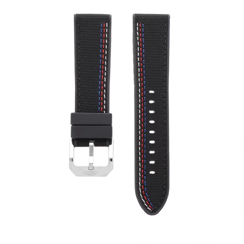 Významný športový remienok vyrobený z hybridného materiálu Sailcloth FKM O modeli hodiniek Prim cyklovanie 25. FKM je jedným z najodolnejších a najpohodlnejších materiálov kombinujúcich luxusný vzhľad, extrémnu výdrž a pohodlie dokonca aj pri vysokých nákladoch.