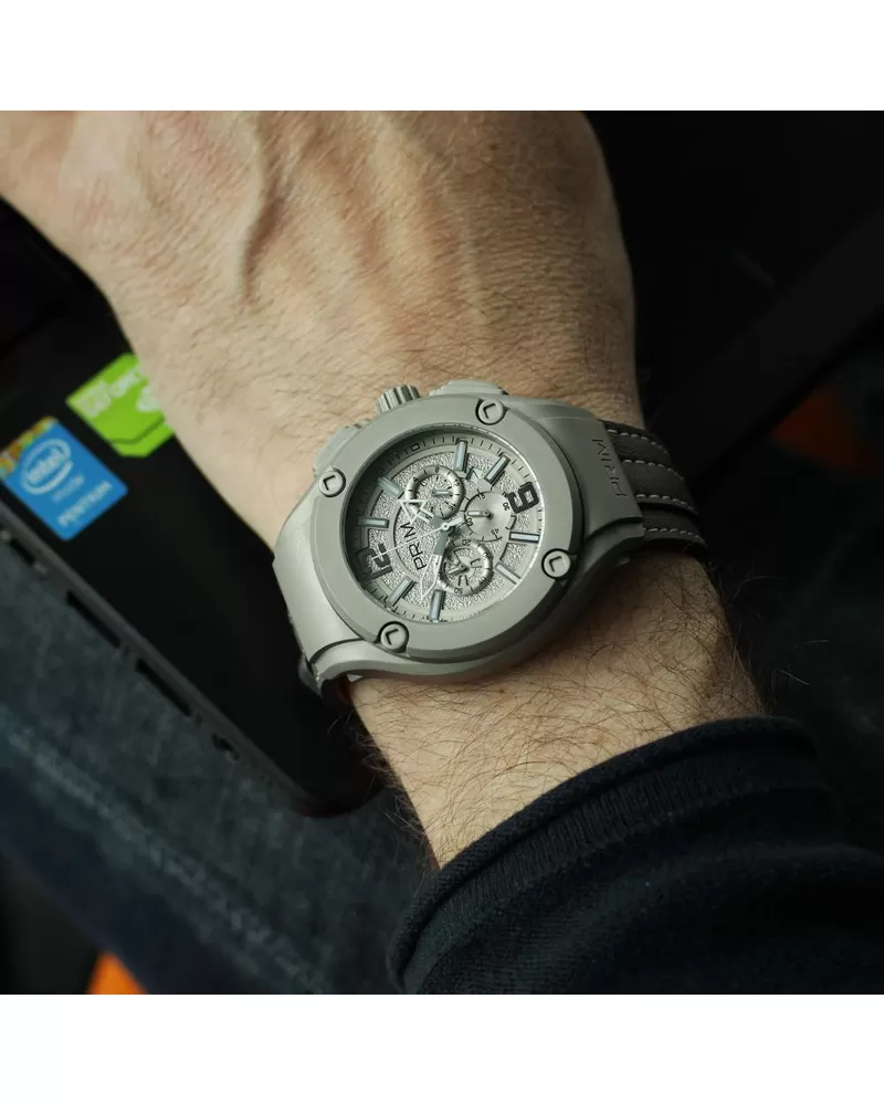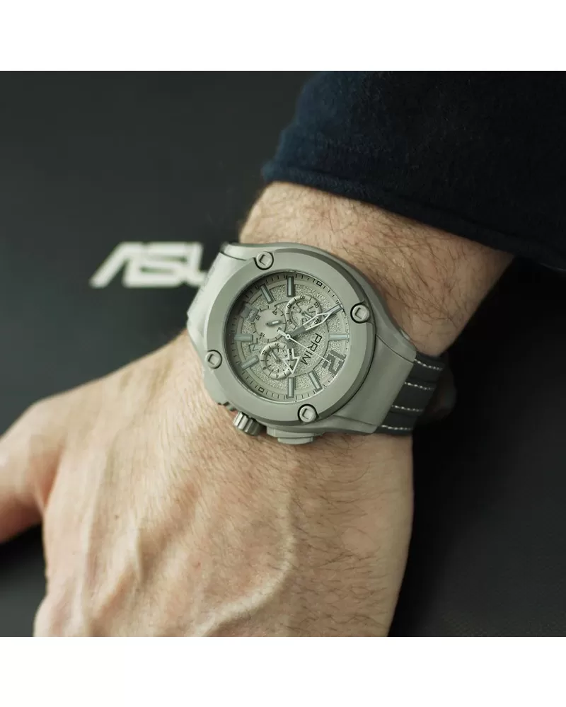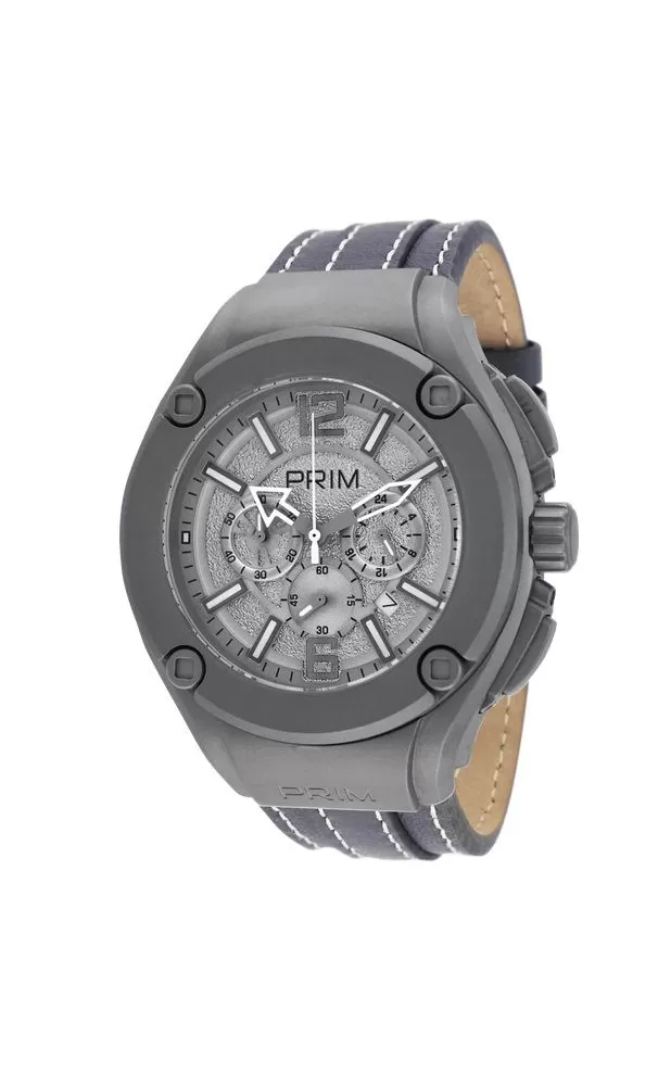 Športový model náramkových hodiniek značky Prim Vás zaujme na prvý pohľad. Okrúhly strieborný ciferník je chránený veľmi odolným minerálnym sklom. Remienok je vyrobený z kože. Hodinky disponujú stopkami, ukazovateľom dátumu a 24 hodinovým ciferníkom.