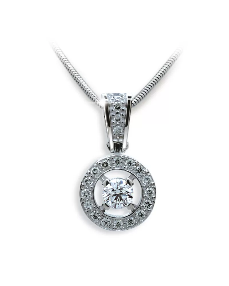 Prívesok s bielymi zirkónmi posadenými po celom svojom obvode as jedným väčším zirkónom uprostred je vyrobený z bieleho štrnástich karátového zlata 585/1000 v lesklej povrchovej úprave.