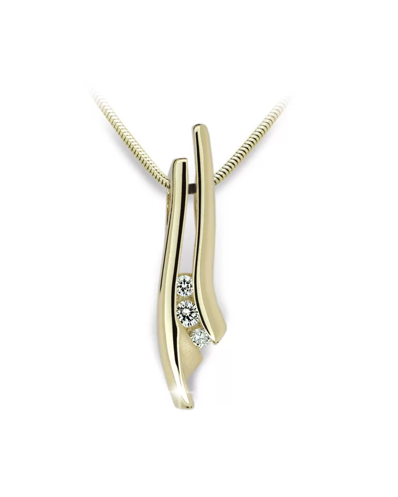 Prívesok s tromi bielymi zirkónmi zo žltého štrnástich karátového zlata 585/1000 v lesklej povrchovej úprave. Prívesok je možné kúpiť s retiazkou, ktorá je vyobrazená na doplňujúcej fotografii.