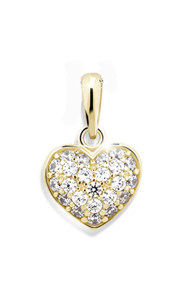 Elegantný prívesok v tvare srdca posádzaný po celom svojom povrchu bielymi zirkónmi je vyrobený zo žltého štrnástich karátového zlata 585/1000. Zlatý prívesok je vyrobený v lesklej povrchovej úprave.