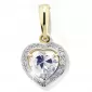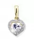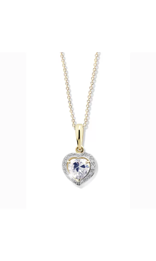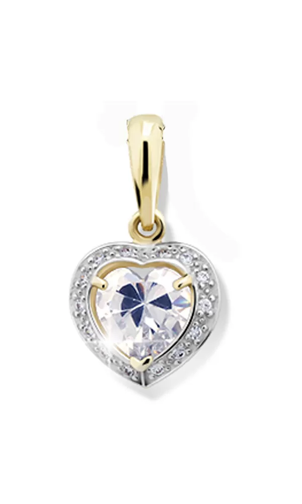 Elegantný prívesok v tvare srdca posadený po svojom obvode drobnými bielymi zirkónmi as uprostred zasadeným jedným väčším bielym zirkónom je vyrobený zo žltého štrnástich karátového zlata 585/1000. Zlatý prívesok je vyrobený v lesklej povrchovej úprave.