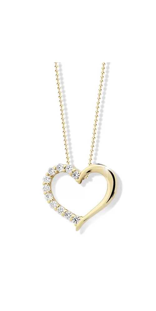 Elegantný prívesok v tvare srdca s bielymi zirkónmi zo žltého štrnásťkarátového zlata s rýdzosťou 585/000 v lesklej povrchovej úprave. Prívesok má očko na retiazku elegantne umiestnené na hornom okraji, vďaka tomu sa retiazka. p>
