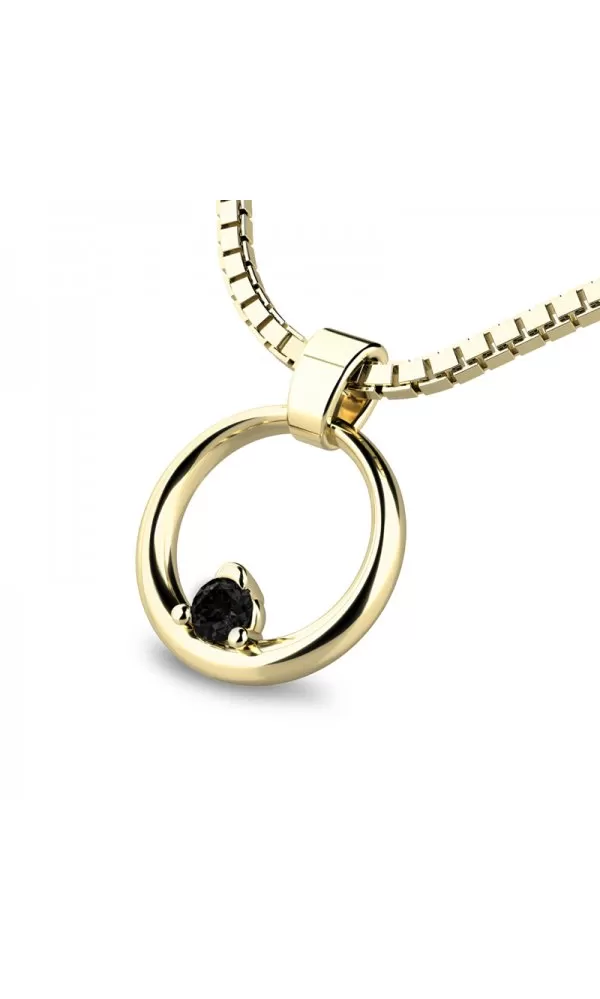 Prívesok v tvare krúžku je vyrobený zo žltého štrnásťkarátového zlata - 585/1000 v lesklej povrchovej úprave s jedným okrúhlym čiernym zirkónom. Každý detail je starostlivo spracovaný, aby vás obklopil jedinečným leskom a pôsobivým vzhľadom. Buďte v centre pozornosti s týmto šperkom, ktorý nielenže ozdobí vašu krásu, ale taktiež podčiarkuje vašu individualitu.