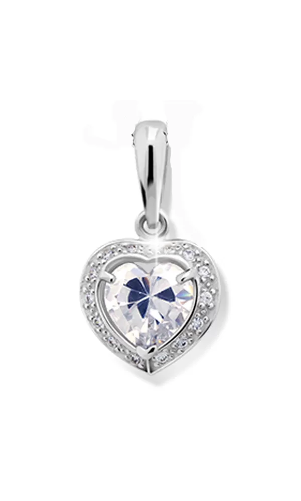 Elegantný prívesok v tvare srdca posádzaný po svojom obvode drobnými bielymi zirkónmi as uprostred zasadeným jedným väčším bielym zirkónom je… Celý popis