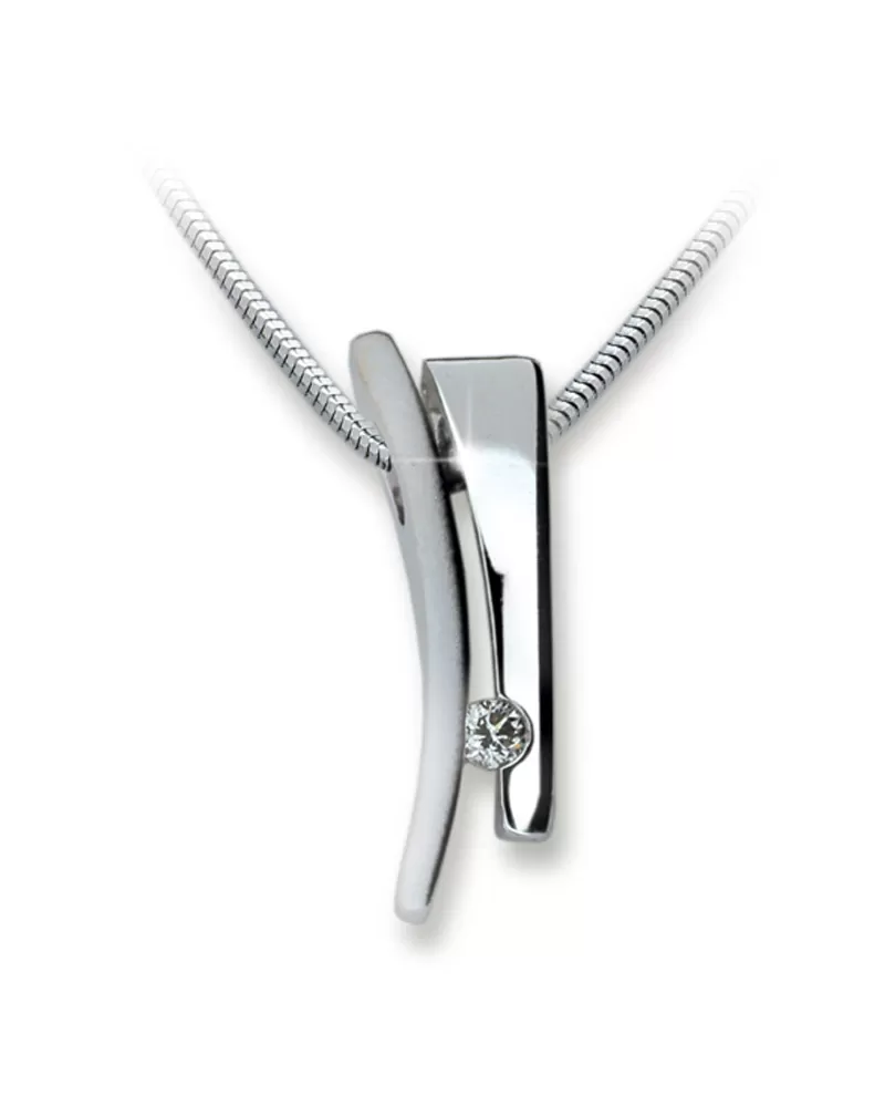 Prívesok s jedným bielym zirkónom je vyrobený z bieleho štrnástich karátového zlata 585/1000 v kombinácii lesklej a matnej povrchovej úpravy.