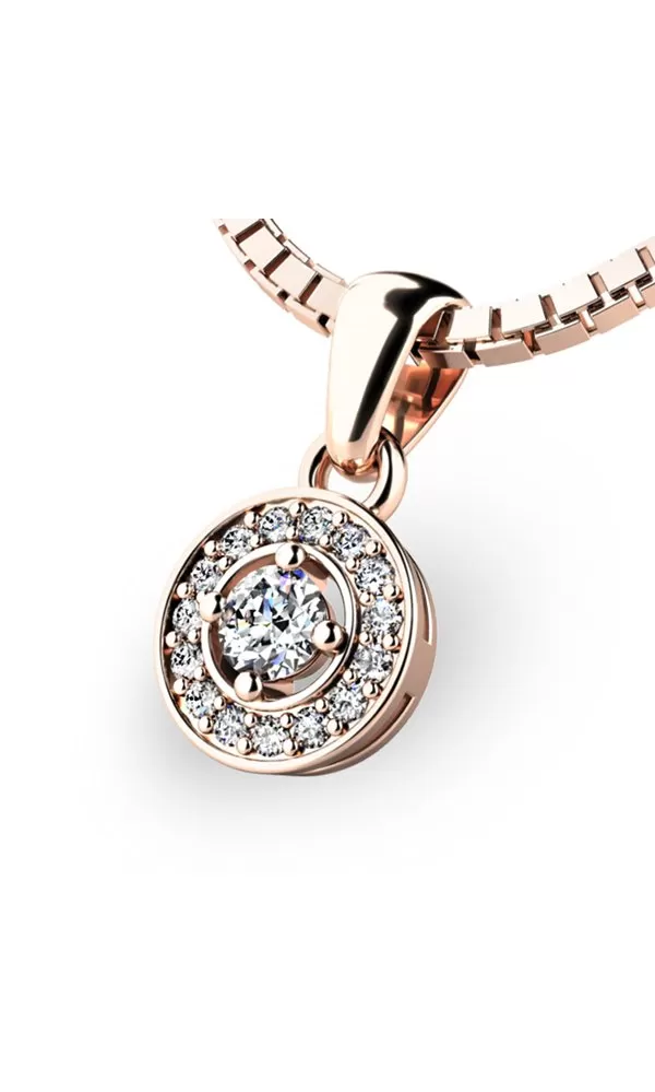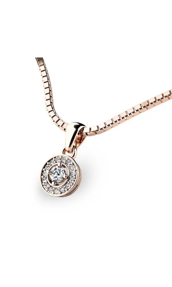 Chcete zapôsobiť na vašu druhú polovičku? S týmto nádherným zlatým príveskom sa Vám to určite podarí! Prívesok je vyrobený z ružového štrnásťkarátového zlata - 585/1000 v lesklej povrchovej úprave. Stredový zirkón žiari svojim jedinečným jasom, priťahujúci pozornosť a dodávajúci nádherný akcent celému klenotu. Okolo neho je vkusne usporiadaných pätnásť drobných zirkónov, ktoré tvoria korunu krásy a jemnosti. Jeho dizajn spája modernú eleganciu s klasickým leskom, čím vytvára šperk vhodný na každú príležitosť.