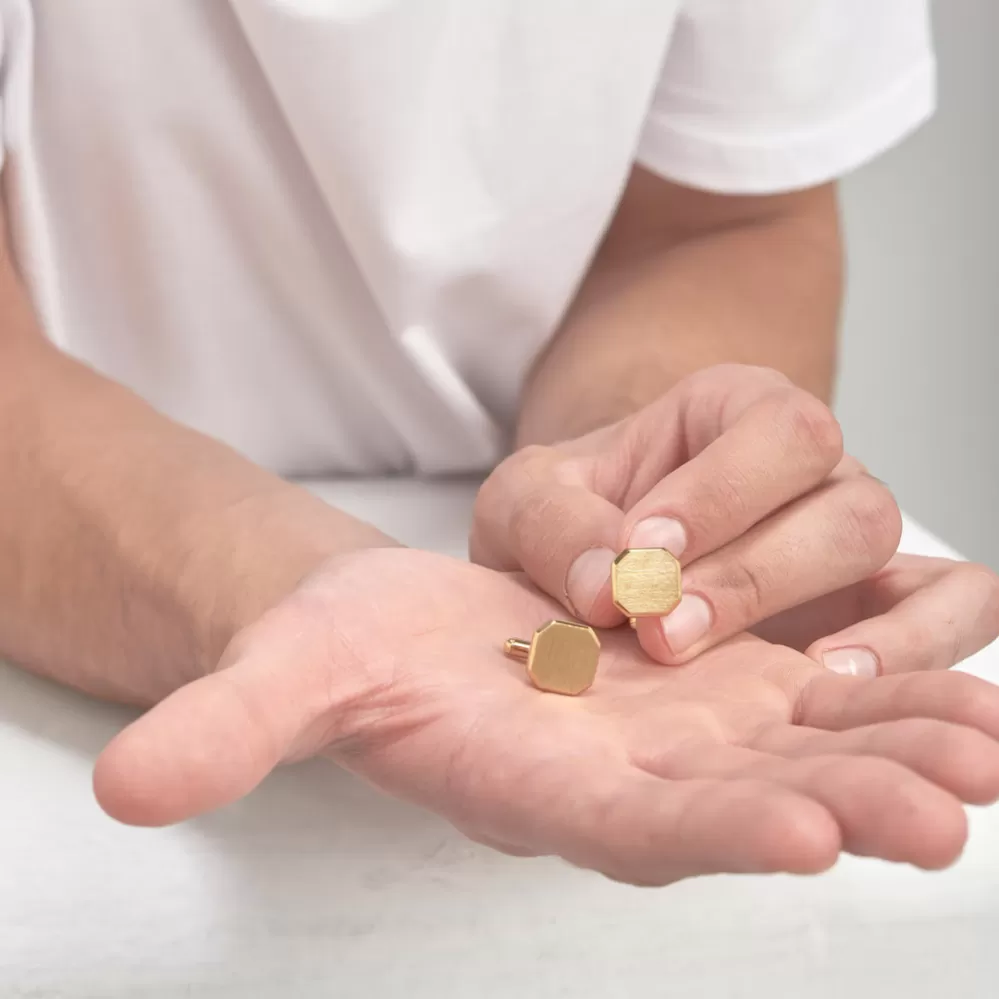 Manžetové gombíky sú vyrobené z vysoko kvalitnej nerezovej ocele v povrchovej úprave vo farbe žltého zlata. Manžetové gombíky sú zdobené precíznou matnou úpravou na povrchu.