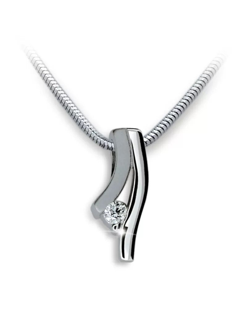 Decentný prívesok bude vo Vašom dekolte vyzerať dokonale. Prívesok je zdobený okrúhlym diamantom, ktorého ligot zvýrazní matná povrchová úprava. Diamant je v briliantovom bruse, ktorý zaisťuje maximálnu brilanciu vybrúsených facet, dokonale odráža svetlo a neuveriteľne žiari z každého uhla pohľadu! Vsadzovanie diamantov vykonávajú naši najskúsenejší majstri zlatníci ručne pod mikroskopom s presnosťou na 0,01mm a preto nehrozí vypadnutie kamienkov ako to býva u strojne vyrábaných príveskov. Šperk je vyrobený z bieleho štrnásťkarátového zlata - 585/1000 v kombinácii matnej a lesklej povrchovej úpravy.
