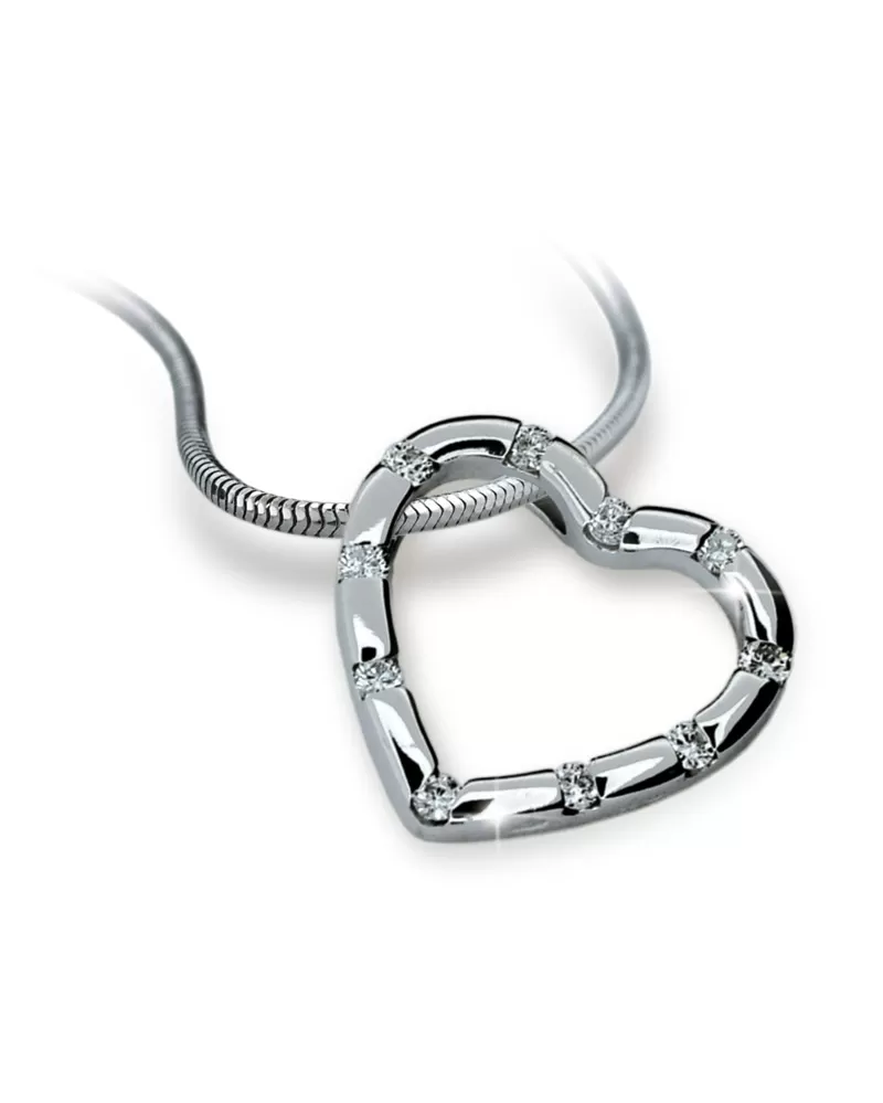 Moderný prívesok v tvare srdca je zdobený desiatimi okrúhlymi diamantmi. Diamanty sú v briliantovom bruse, ktorý zaisťuje maximálnu brilanciu vybrúsených facet, dokonale odráža svetlo a neuveriteľne žiari z každého uhla pohľadu! Vsadzovanie diamantov vykonávajú naši najskúsenejší majstri zlatníci ručne pod mikroskopom s presnosťou na 0,01mm a preto nehrozí vypadnutie kamienkov ako to býva u strojne vyrábaných príveskov. Príves je vyrobený z bieleho štrnásťkarátového zlata - 585/1000 v lesklej povrchovej úprave.