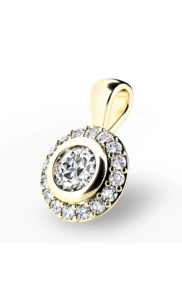 Ozdobte dekolt svojej partnerky dokonalým skvostom vo forme zlatého prívesku s briliantmi. Prívesok je zdobený jedným hlavným diamantom briliantového brusu, ktorý je vsadený uprostred a šestnástimi menšími diamantmi briliantového brusu, ktoré sú vsadené okolo. Vďaka precíznemu brúsu diamanty získajú dokonalú brilanciu. Skvele odráža svetlo a september.