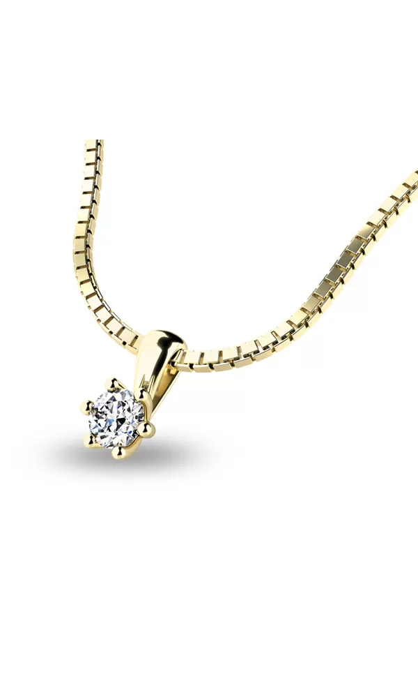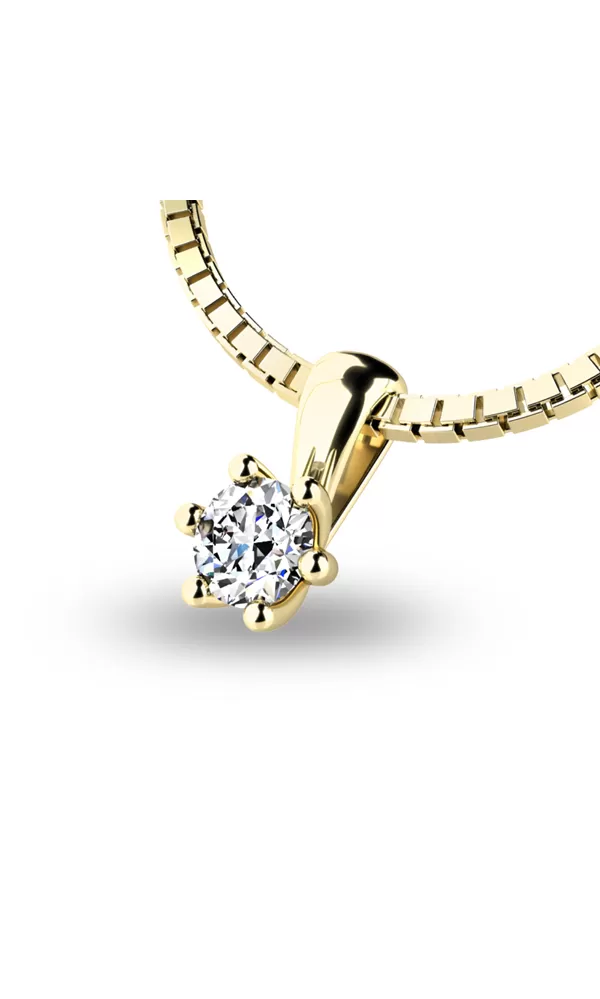 Nechajte sa uchvátiť dokonalým leskom prvotriedneho diamantu vsadeného do prívesku, ktorý je vyrobený zo žltého štrnásťkarátového zlata - 585/1000 v lesklej povrchovej úprave. Diamant je pevne vsadený do šesťkrapnovej korunky. Diamant je vybrúsený briliantovým brusom, vďaka ktorému dokonale odráža svetlo a neuveriteľné september. Vsadzovanie diamantov a drahých kameňov vykonávajú naši najskúsenejší majstri zlatníci ručne pod mikroskopom s presnosťou na 0,01mm a preto nehrozí vypadnutie kamienkov ako to býva u strojne vyrábaných príveskov.