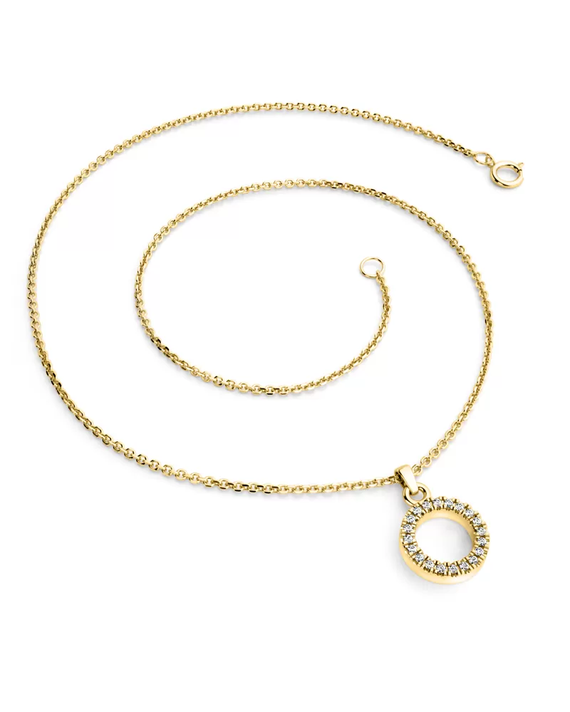 Elegantný kruhový prívesok je vyrobený zo žltých štrnástich -karátových zlatých -585/1000 v lesklej povrchovej úpravu a vložený 20 okrúhlych… Celý popis