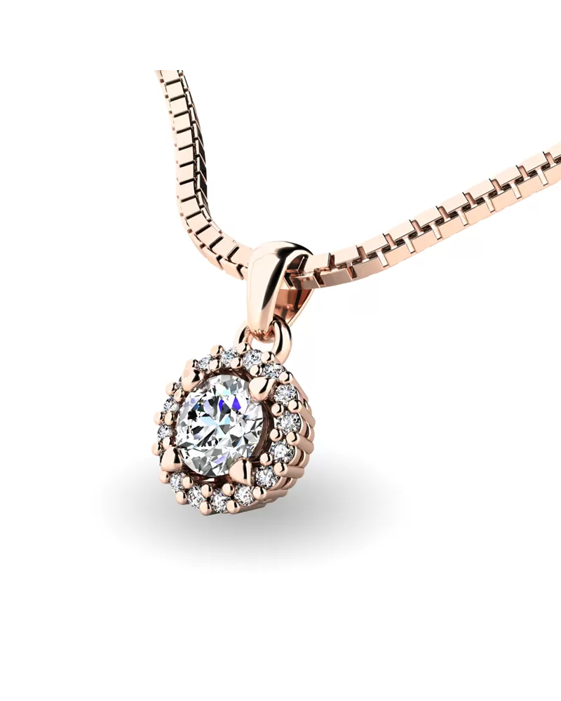 Nádherný prívesok zdobený väčším stredovým diamantom a menšími diamantmi určite poteší každú ženu. Prívesok je vyrobený z ružového štrnásťkarátového zlata - 585/1000 v lesklej povrchovej úprave. Vsadené diamanty sú vybrúsené dokonalým briliantovým brusom, vďaka ktorému dokonale odráža svetlo a ich brilancia neuveriteľné žiari z každého uhla pohľadu! Všetky diamanty sú pevne uchytené krapnami. Vsadzovanie diamantov vykonávajú naši najskúsenejší majstri zlatníci ručne pod mikroskopom s presnosťou na 0,01 mm a preto nehrozí vypadnutie kamienkov ako to býva u strojne vyrábaných náušníc. Celé náušnice pôsobia dokonalým a luxusným dojmom!